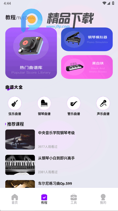 3、深入教程板块,这里堪称音乐爱好者的梦幻乐园,内置热门曲谱库,钢琴模拟器、黑白快节奏曲谱各类乐器曲谱资源丰富齐全。