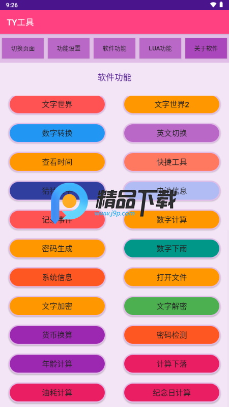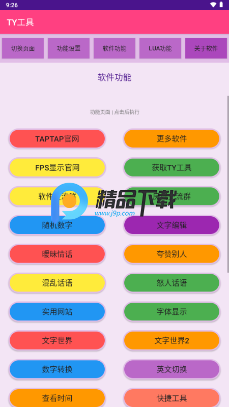 TAPTAP官网、FPS显示官网、软件交流群、随机数字、暧昧情话、混乱话语、实用网站、文字世界、数字转换、查看时间、获取TY工具、房间交流群、文字编辑、夸赞别人、怒人话语、字体显示、文字世界2、英文切换、快捷工具、猜猜数字、记录事件、密码生成、系统信息、文字加密、货币换算、年龄计算、油耗计算、电池信息、数字计算、数字下雨、打开文件、文字解密、密码检测、计算下落、纪念日计算
