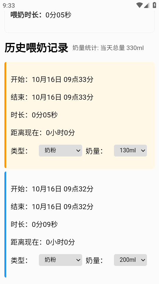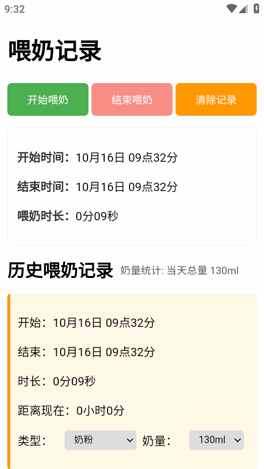 3、点结束喂奶可以看到记录,支持修改类型和奶量。