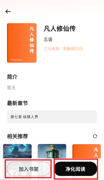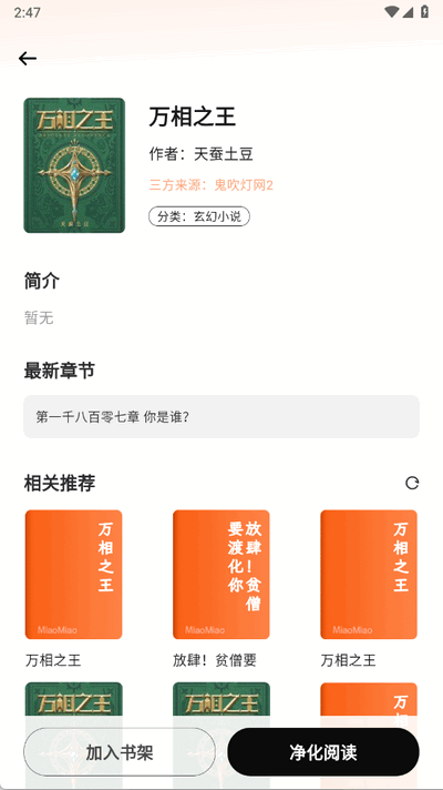 进入小说简介界面后可以点击加入书记,点击净化阅读