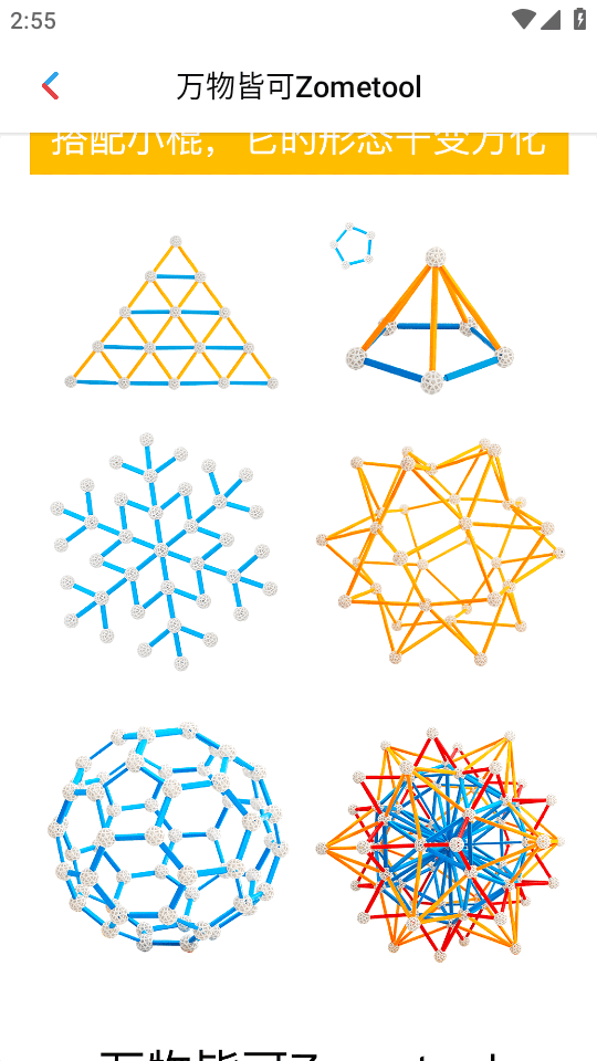 几何超能力,使用Zometool发挥你的创意,Zometool拼搭玩具官方手机客户端,拥有六大主题,可以轻松进入学习参考,新手入门课程让玩家轻松上手,还有很多趣味探索内容,200+模型库360度自由探究。