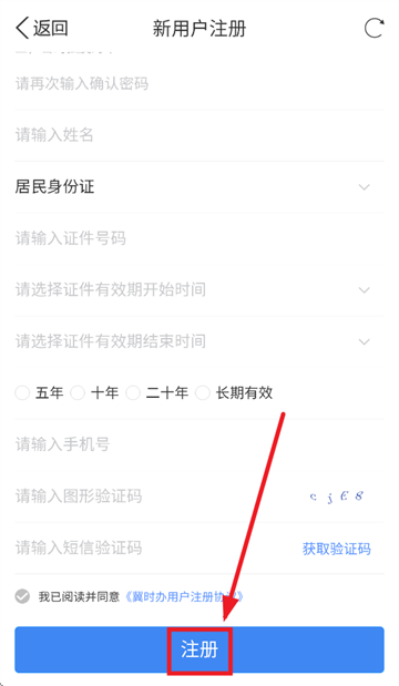 在新用户界面选择个人注册,填写相关需求信息,勾选我已阅读并同意 《冀时办用户注册协议》,点击注册即可