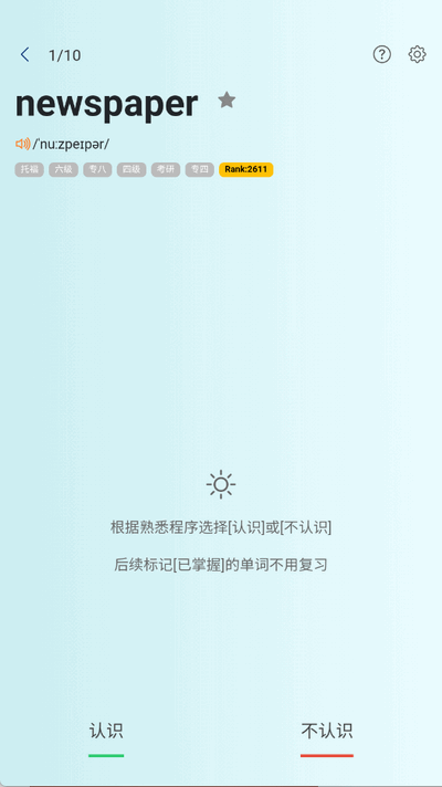 进入学习界面后,根据对单词(如“newspaper”)的熟悉程度,选择“认识”或“不认识”,系统会据此调整后续复习策略。