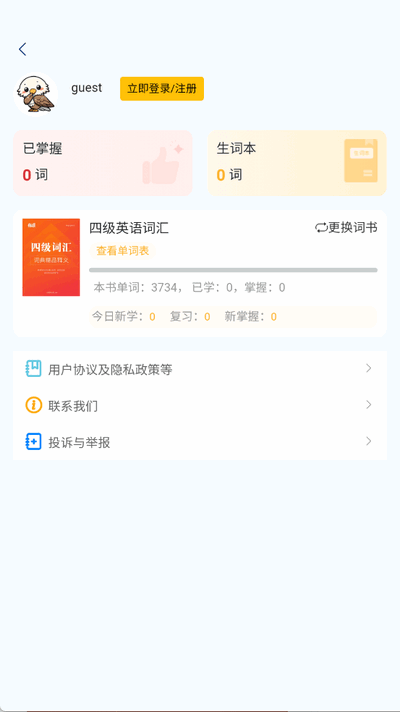 在主界面可查看当前单词书(如《四级英语词汇》)的总单词数、已学数和剩余数,也可点击“换书”切换其他单词书。