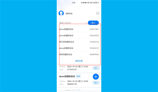 ①如您曾通过会议ID方式入会,您可点击会议ID输入处的下拉图标,并在下拉框中点击对应的会议直接入会
