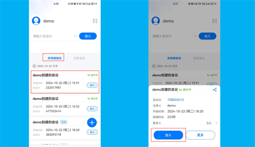 ①所有您创建、被邀请或参加过的会议均会被添加至会议列表,您可前往首页“未完成会议”处点击状态为“进行中”的会议打开弹窗查看会议详情,并可点击弹窗中的“入会”按钮加入会议