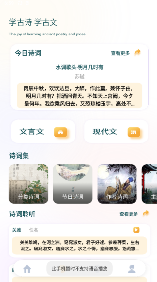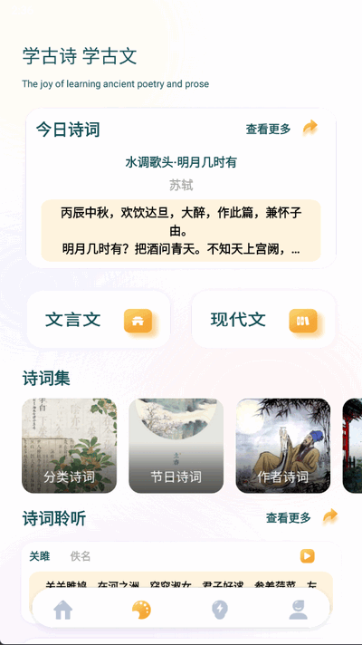 3、古诗赏析:提供详细解读、朗诵示范,引导用户体会诗词的意境与韵律之美。