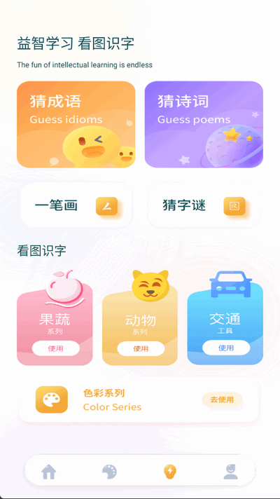 4、看图识字:包含猜成语、猜诗词、一笔画、谜语等趣味活动,增强学习趣味性。