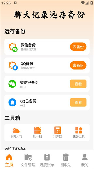 2、打开应用首页自动识别聊天软件中的可备份文件,按时间轴或文件类型分类呈现,查找更便捷。