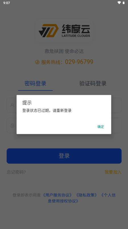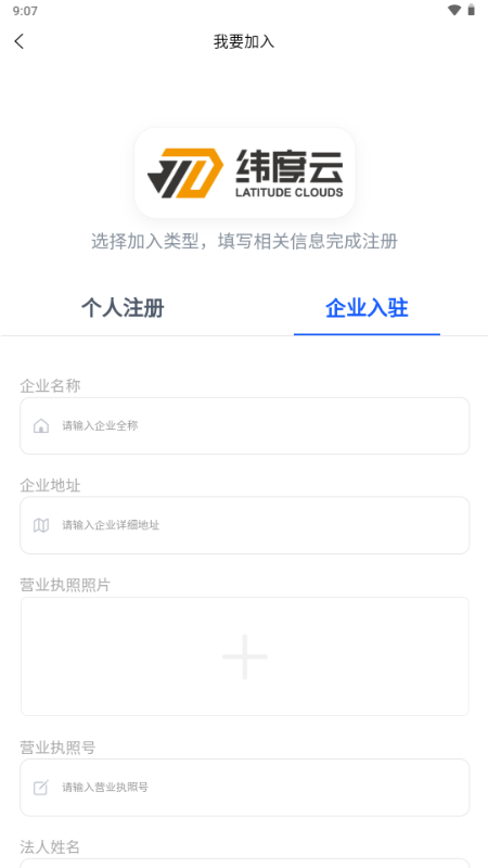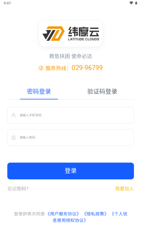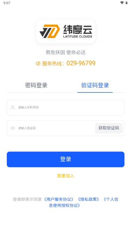 打开纬度云救援APP,点击"我要加入"进入注册页面。