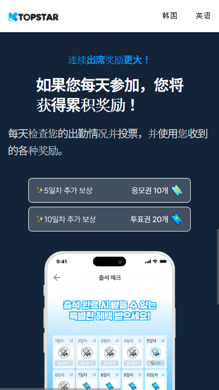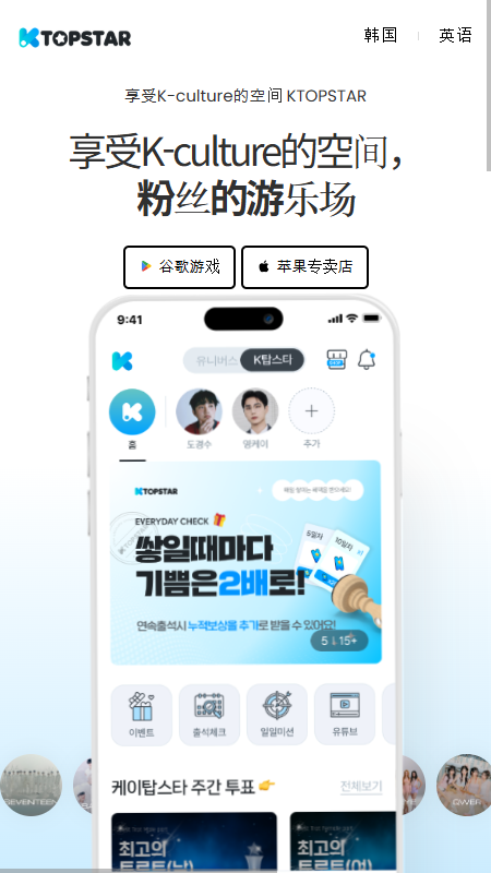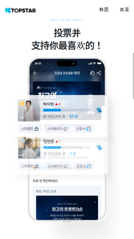 KTOPSTAR 是一款专为偶像粉丝打造的投票类软件,为全球粉丝提供了一个互动和追星的平台。它不仅提供了丰富的投票系统,包括周投票、放送投票和颁奖典礼投票,还设有粉丝团社区,方便粉丝获取偶像的最新消息并与同好交流。