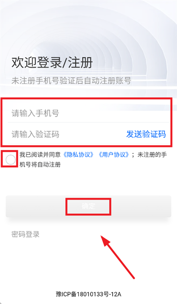 输入手机号,验证码,勾选我已阅读并同意 《隐私协议》 《用户协议》;未注册的手机号将自动注册,点击确定即可
