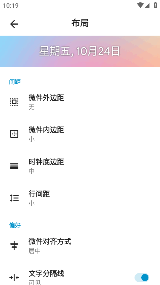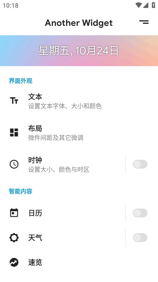支持中文非常简约清爽的一款手机小组件设置软件,Another Widget小组件打开即可直接使用,拥有丰富的自定义功能,可以随意调整和设置相关参数,打造专属小组件效果,可以制作日历,天气,时钟等常用的小组件,很易使用,没有任何的广告和付费内容。