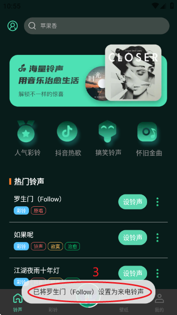 授权后即可成功将铃声设置为来电铃声,如“罗生门(Follow)”设置为来电铃声。