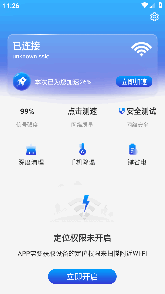 界面极简清爽好用的一款手机提升wifi速度的工具,加速WiFi免费版,下载安装好后即可免费使用,没有任何的广告,除了支持加速,还可以清理优化手机性能,让你的手机运行更加流畅,帮助手机省电和降温,全都免费使用,手机卡顿反应慢的必备。