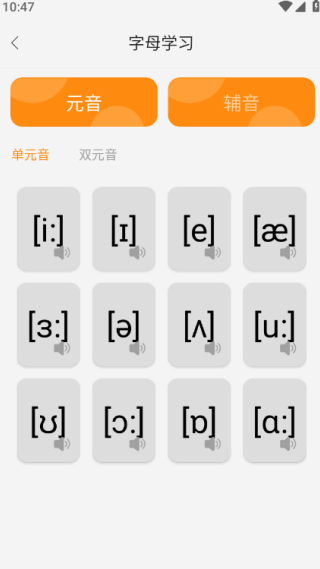 2、在线可以学习单元音,双元音,点击喇叭可以获取对应的真人发音。