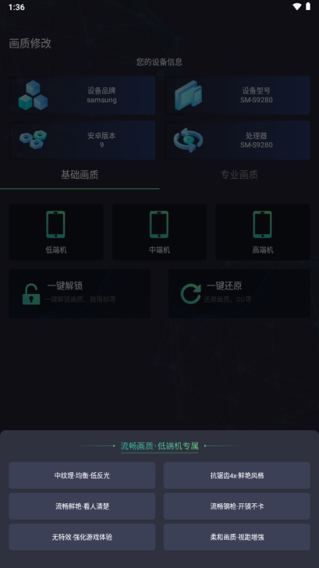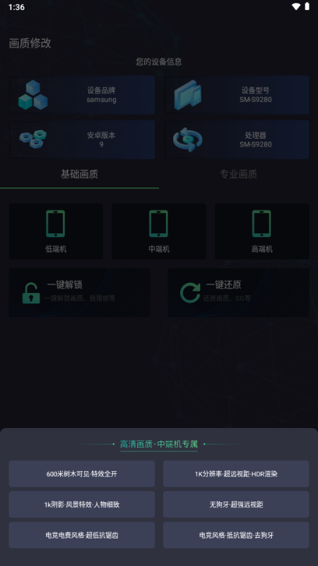 3、针对不同的手机型号会有不同适配的版本,在修改画质之前,需要选择自己手机的型号,还可以设置多种语言。