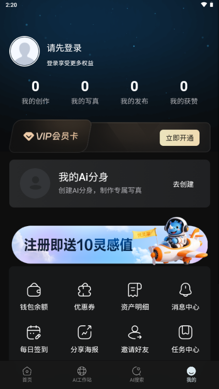 1、进入app后新用户注册登录可免费得到平台灵感值,这个灵感值可以免费进行ai绘画创作