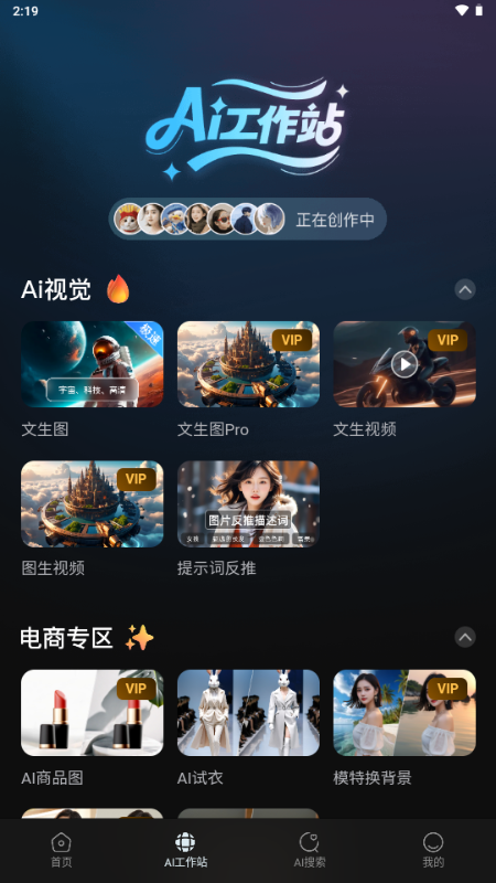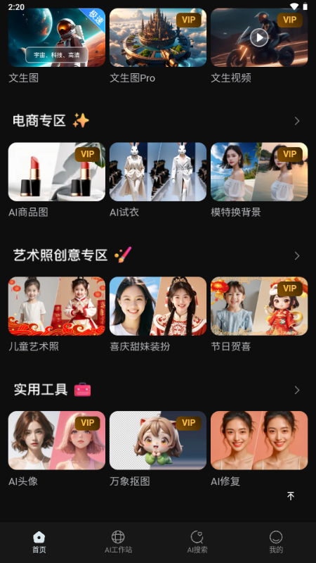 2、app首页中即可根据自己的需求选择不同的ai应用场景进行ai绘画创作