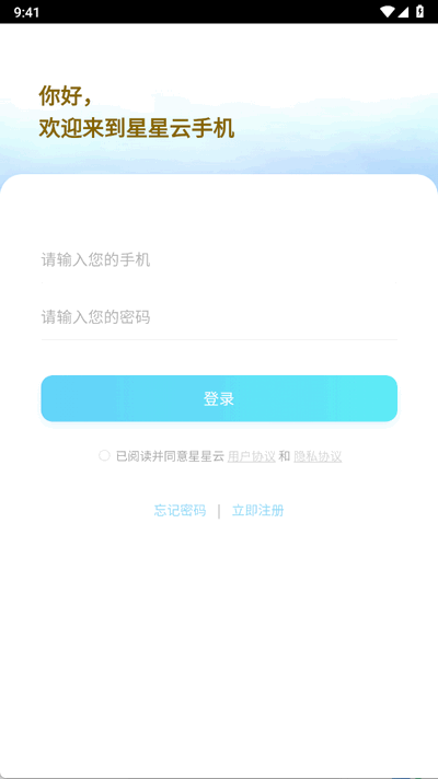 打开APP后,在登录界面输入手机号码和密码,勾选“已阅读并同意星星云用户协议和隐私协议”,点击“登录”按钮即可进入。若未注册可点击“立即注册”,忘记密码可点击“忘记密码”。