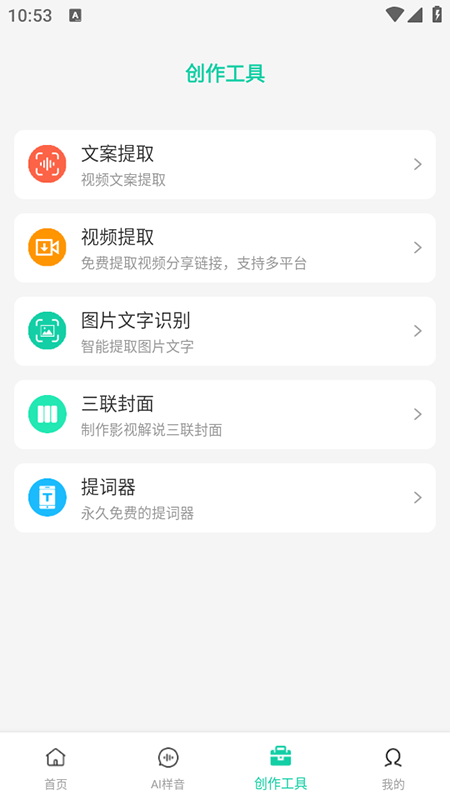 4、辅助创作模块:如快速制作抖音三联封面、悬浮提词器(永久免费无广告)、语音转文字、图片转文字等实用功能。