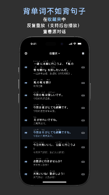 7:在收藏夹中反复重放收藏的句子(支持后台播放),通过“背句子”的方式高效学习外语,同时可查看源对话,加深对句子语境的理解。