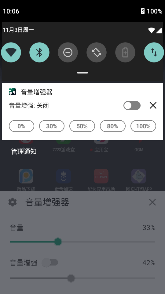 界面非常简洁好用,安装包极小的一款手机音量增强工具,音量增强器app支持悬浮窗的功能,没有任何的广告,设置功能也很纯粹好用,快速增加音频至30%,50%,80%,最高可以到100%,支持在通知栏向下拉,选择一键关闭按钮,非常不错。