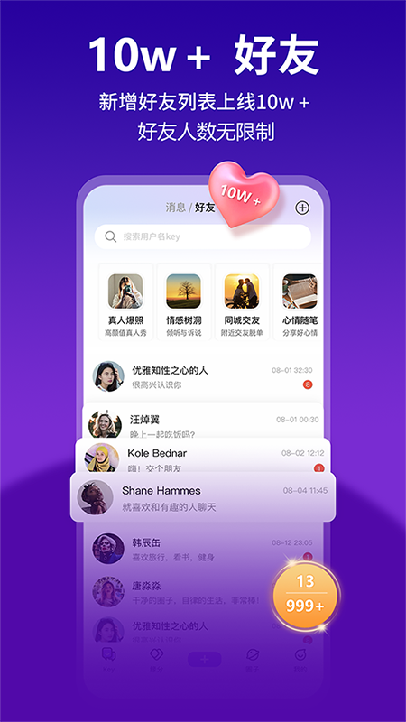 KeyChat是一款交友软件,陌生人交友必备软件,通过真人认证和人工审核确保用户的真实性。用户可以在这里结识同城及各地的高颜值朋友,加入感兴趣的圈子,结交志同道合的人。KeyChat支持管理好友交友功能,提供高度的隐私保护和个性化的交友体验。