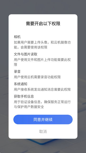 2:APP会请求开启相机、文件与片读取、录音、系统通知、获取手机信息等权限,点击“同意并继续”授予权限,可正常使用APP功能;点击“取消”则不授予权限,部分功能可能无法使用。