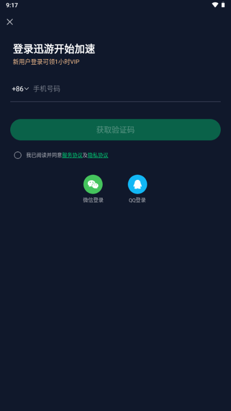 1、打开迅游手游加速器,进入【我的】界面,点击上方【头像】图标,