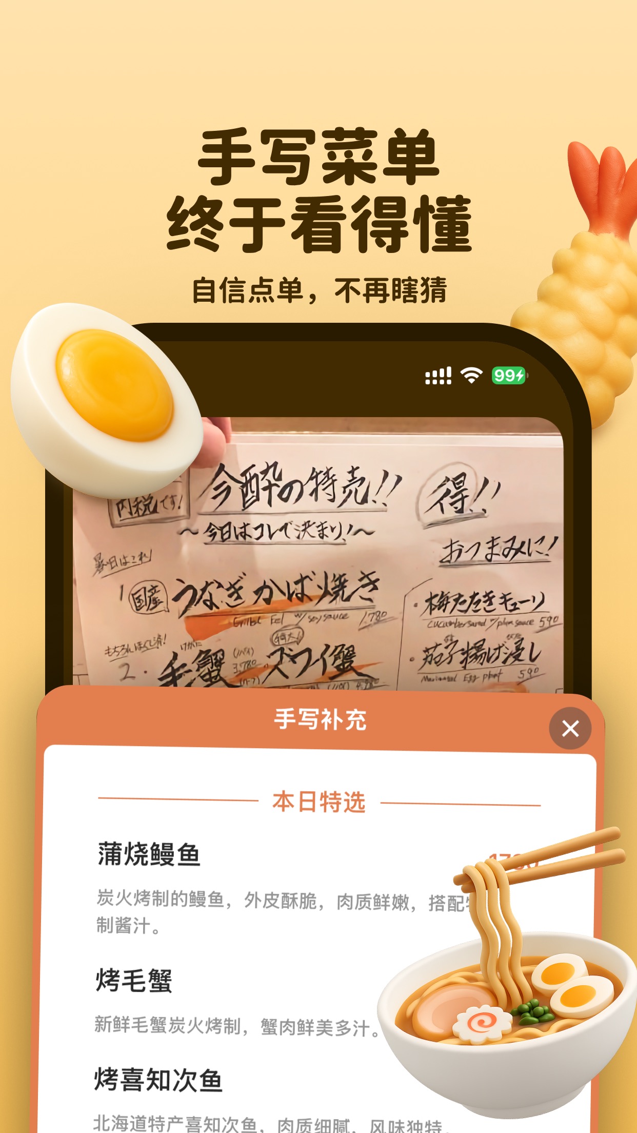 1、菜单翻译:支持多种语言的菜单即时翻译,包括手写菜单。