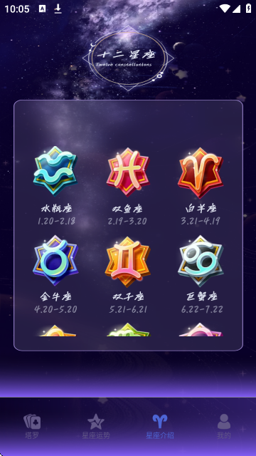 5:点击“星座介绍”板块,可查看十二星座(水瓶座、双鱼座、白羊座等)的标及时间范围,选择感兴趣的星座。