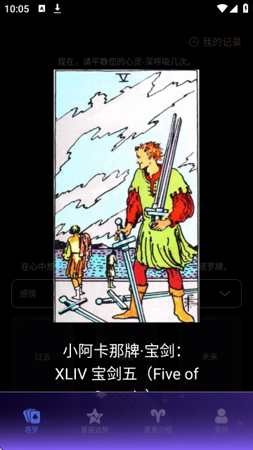 3:选择后点击塔罗牌进行发牌,查看牌面(如小阿卡那牌-宝剑五)及对应的解析内容。