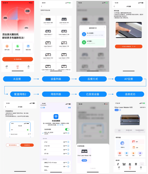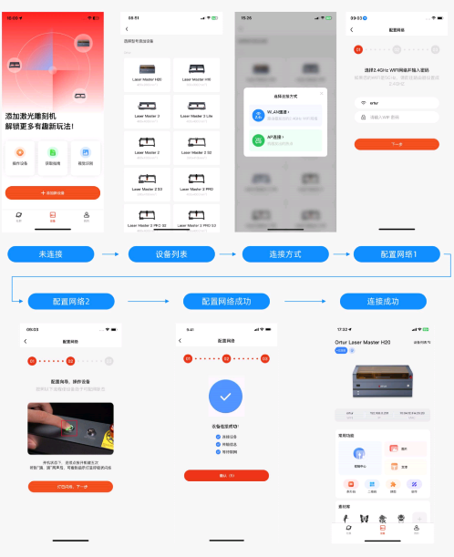 1.在设备界面点击“添加新设备”按钮,进入设备列表-选择相应机型-选择AP连接-连续点击开机键3次,听到”哗“提示音后长按1秒-直至听到连续的"哗“提示音后松开-看到指示灯进入呼吸状态-点击下一步