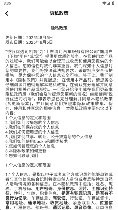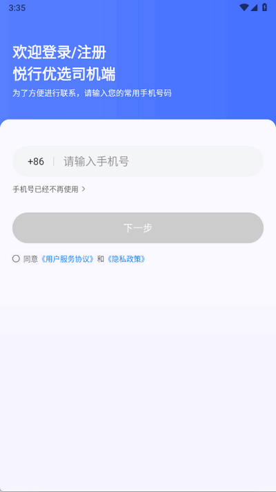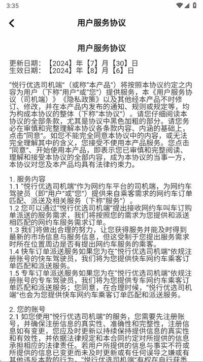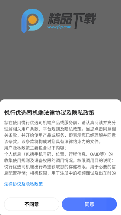 打开悦行优选司机端app,先同意悦行优选司机端法律协议及隐私政策