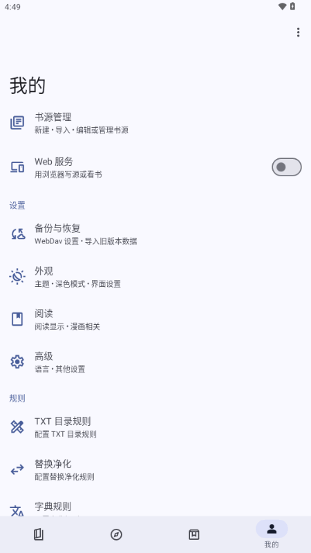1、打开开源阅读App,点击我的,进入书源管理界面;