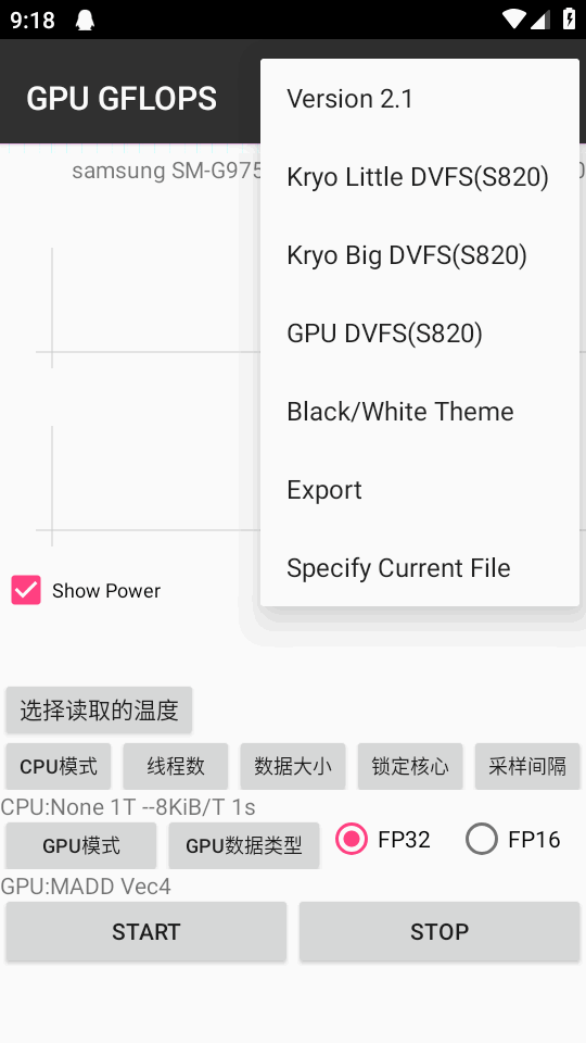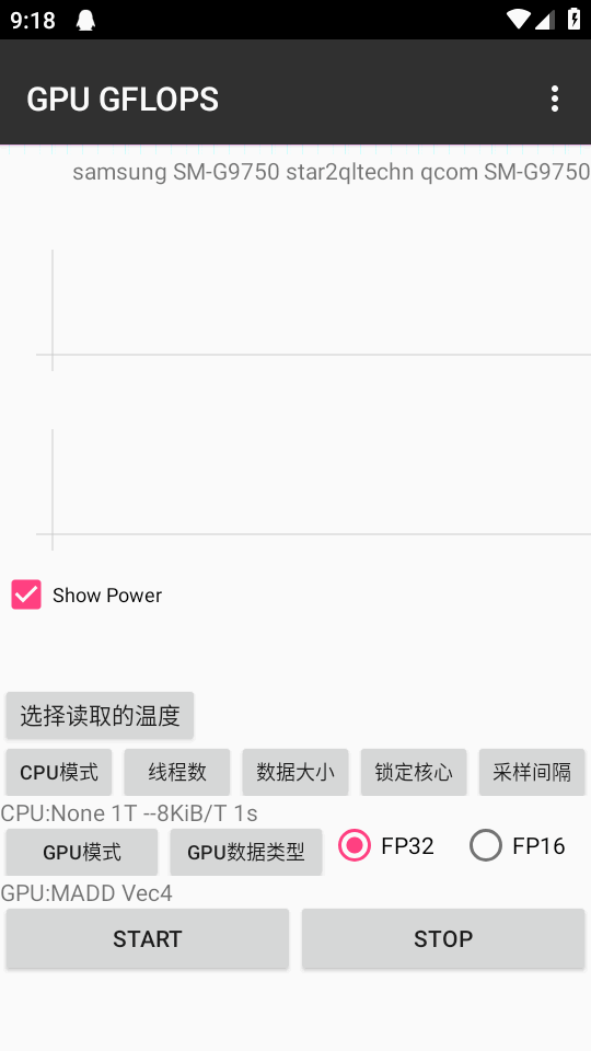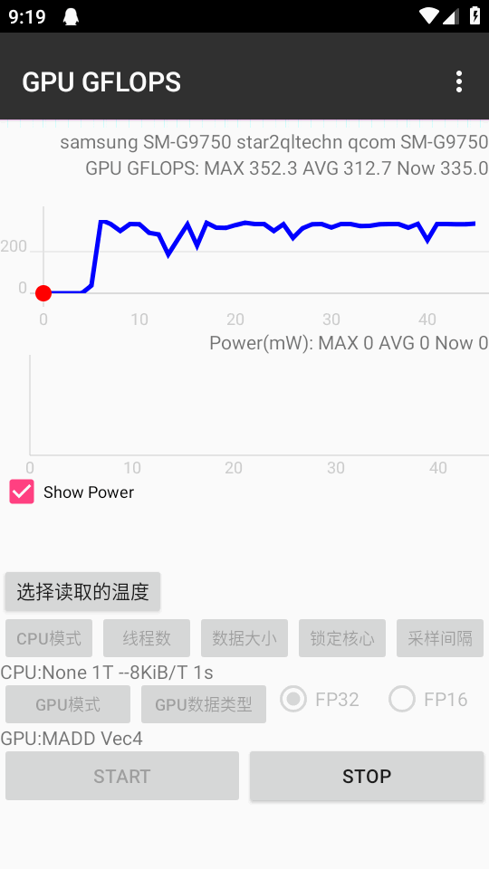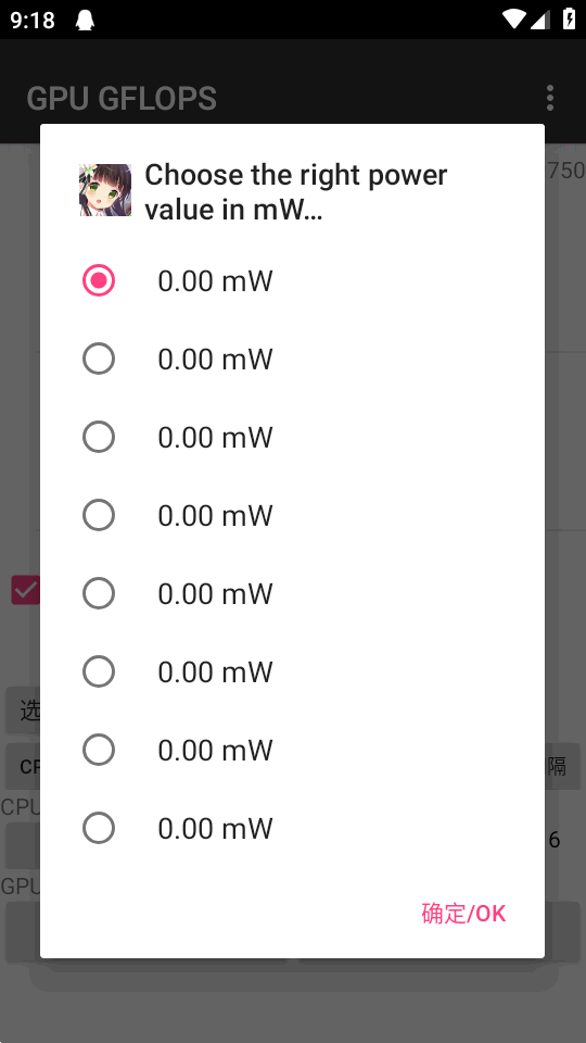 1、打开软件后会显示手机GPU的实际功率消耗值,用户选择一个GPU的功率值进行测试