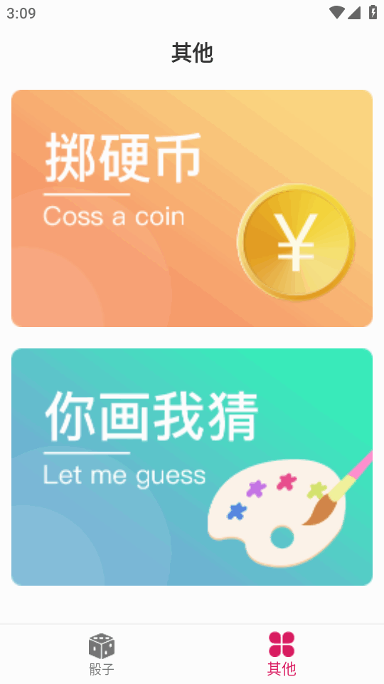 很简洁有趣的一款聚会娱乐用的工具,小骰子app是个完全免费的工具,主要有三大功能,摇骰子,抛硬币猜正反和你画我猜,界面清爽干净,使用方便,很适合在聚会时提升大家的兴趣及互动,活跃氛围必备的应用。