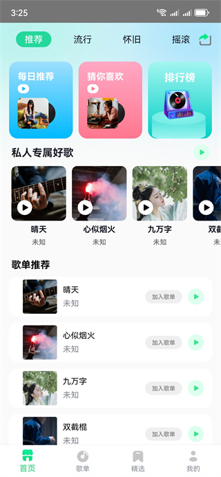 2、提供一些歌曲推荐,不同风格类型的音乐可以收听;