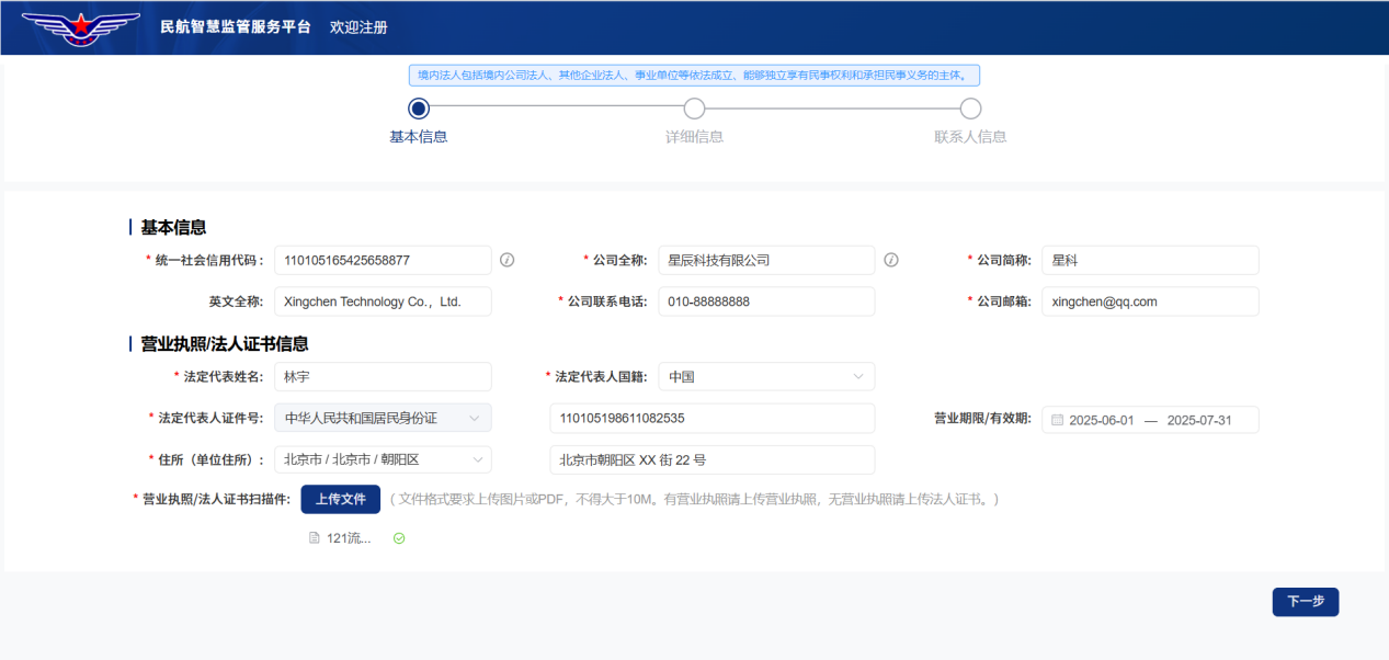 行政相对人注册分三步,依次是“基本信息-详细信息-联系人信息”,填写基本信息时请根据公司注册的执照信息正确填写,确保无误,点击【下一步】按钮完成基本信息的填报。