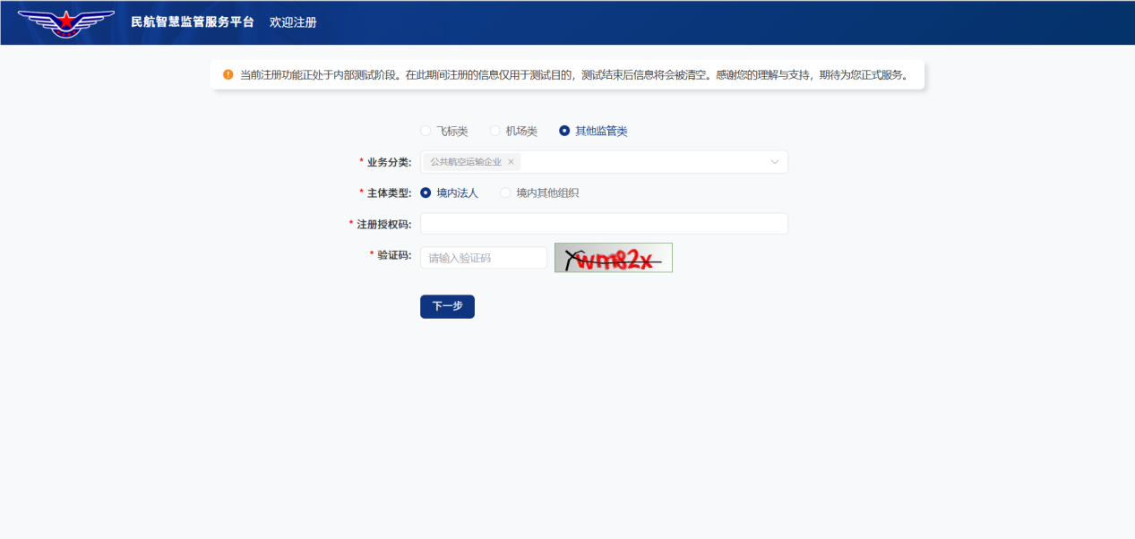 依次选择相应的业务分类、业务主体,行业机构用户输入从管理局获取到的业务授权码,并输入注册验证码后,点击【下一步】按钮进入详细注册页面