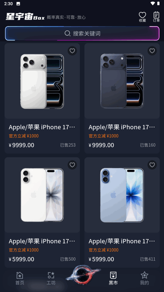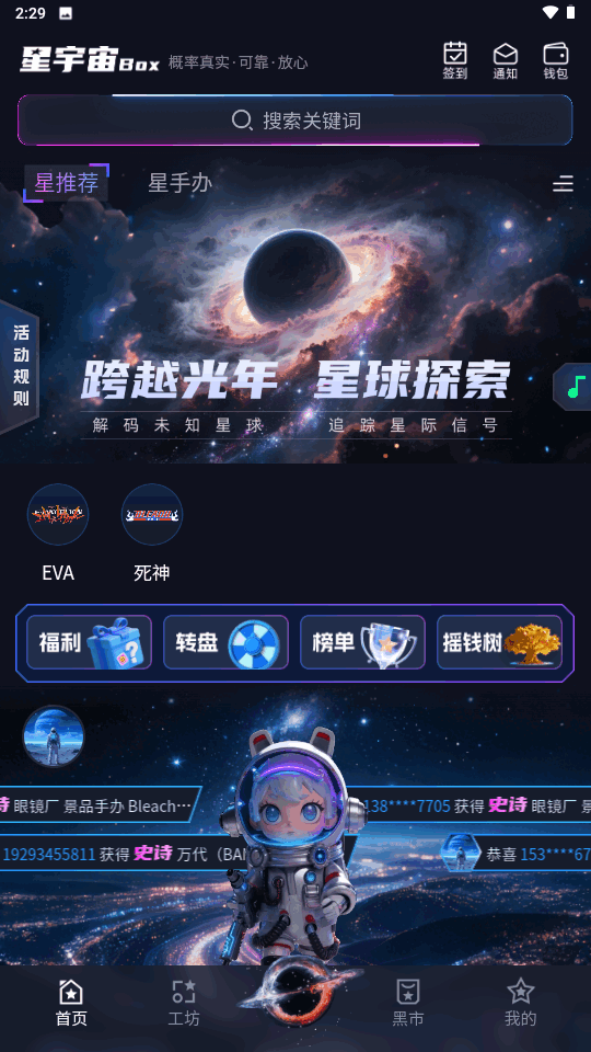 平台对新人非常友好,首次下载注册的新用户,专享首抽福利仅需 0.01 元,即可解锁开盒资格!当下热门的数码产品、收藏圈抢手的高端腕表、萌趣十足的潮玩手办等都能带回家!平台开盒均为实物,商品质量有保障!平台还汇集了多个知名品牌和设计师的合作限量版盲盒,让大家能够在首发时完成购买。还会定期更新全新的潮玩盲盒合集,确保大家能够持续体验最新最炙手可热的宇宙主题盲盒。