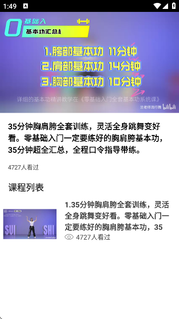 3:在基本功课程页面,可查看如“35分钟胸肩胯全套训练”等课程,点击课程即可进入学习,跟随视频进行基本功训练。