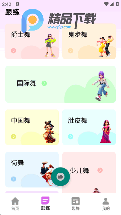 4:进入“跟练”板块,选择爵士舞、中国舞等舞种分类,点击进入后可选择具体舞蹈进行跟练学习。