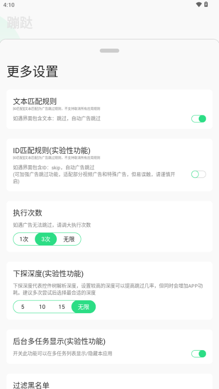 蹦跶是一款高效且完全免费的广告屏蔽工具,无需ROOT即可使用。它专注于自动识别并跳过APP首屏广告,支持视频广告、弹窗广告等多种形式,通过智能识别技术为用户提供流畅的网络体验。此外,蹦跶还支持自定义设置,用户可根据需求选择屏蔽特定平台或类型的广告。