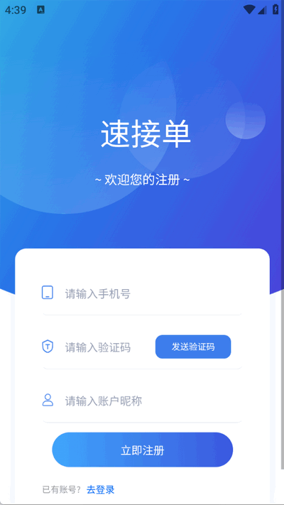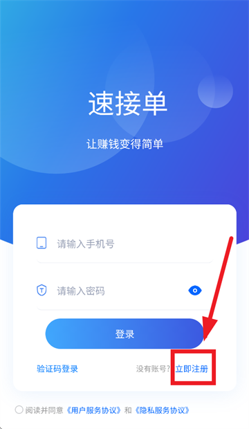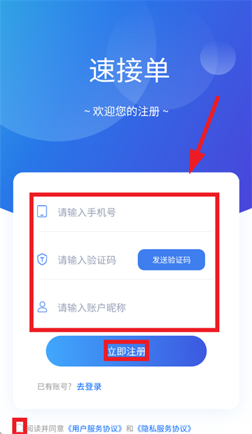 输入手机号,验证码,用户昵称,勾选阅读并同意 《用户服务协议》 》和《隐私服务协议》,点击立即注册即可