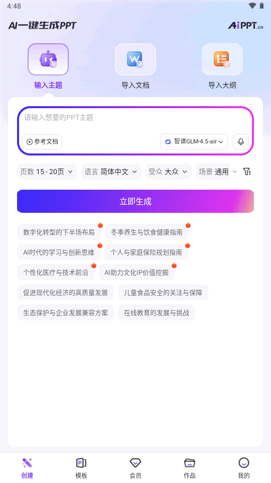 aippt是一款专业的ppt生成器软件,通过AI技术赋能,让用户仅需输入主题或关键词,就能完成从内容生成到视觉设计的全流程操作。无论是职场汇报、学术展示,还是活动策划、产品介绍,都能依托其海量模板与智能填充功能,快速产出高质量PPT。