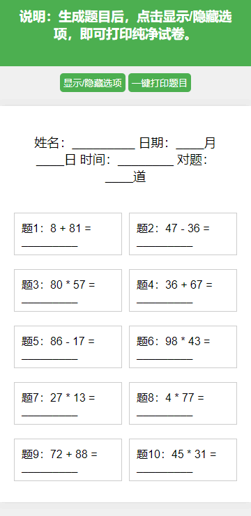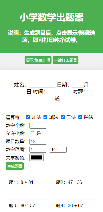 非常好用适合家长和老师的一款一键口算生成器,小学生数学出题器是个完全免费的工具,支持自定义运算符号,数字个数,数字大小,还支持打印设置,可以轻松生成小学生在家口算练习的计算册,非常方便易用,每个小学家长必备。