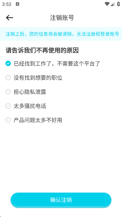 5、勾选不再使用原因,最后点击下方确认注销完成注销操作。