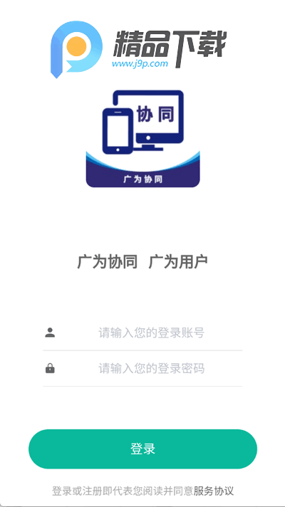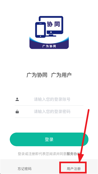 打开广为协同app,进入登录界面后下拉界面选择用户注册